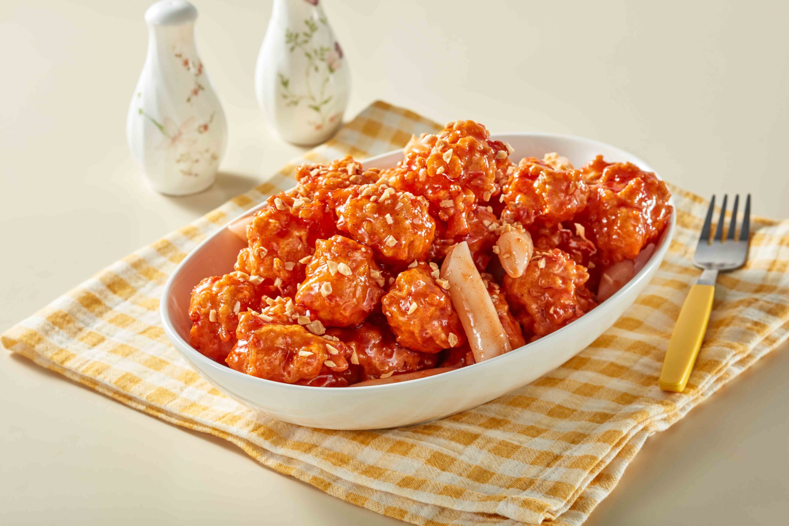 바삭하게 튀긴 닭강정에 큰집 특제 매운 소스를 듬뿍 입혀