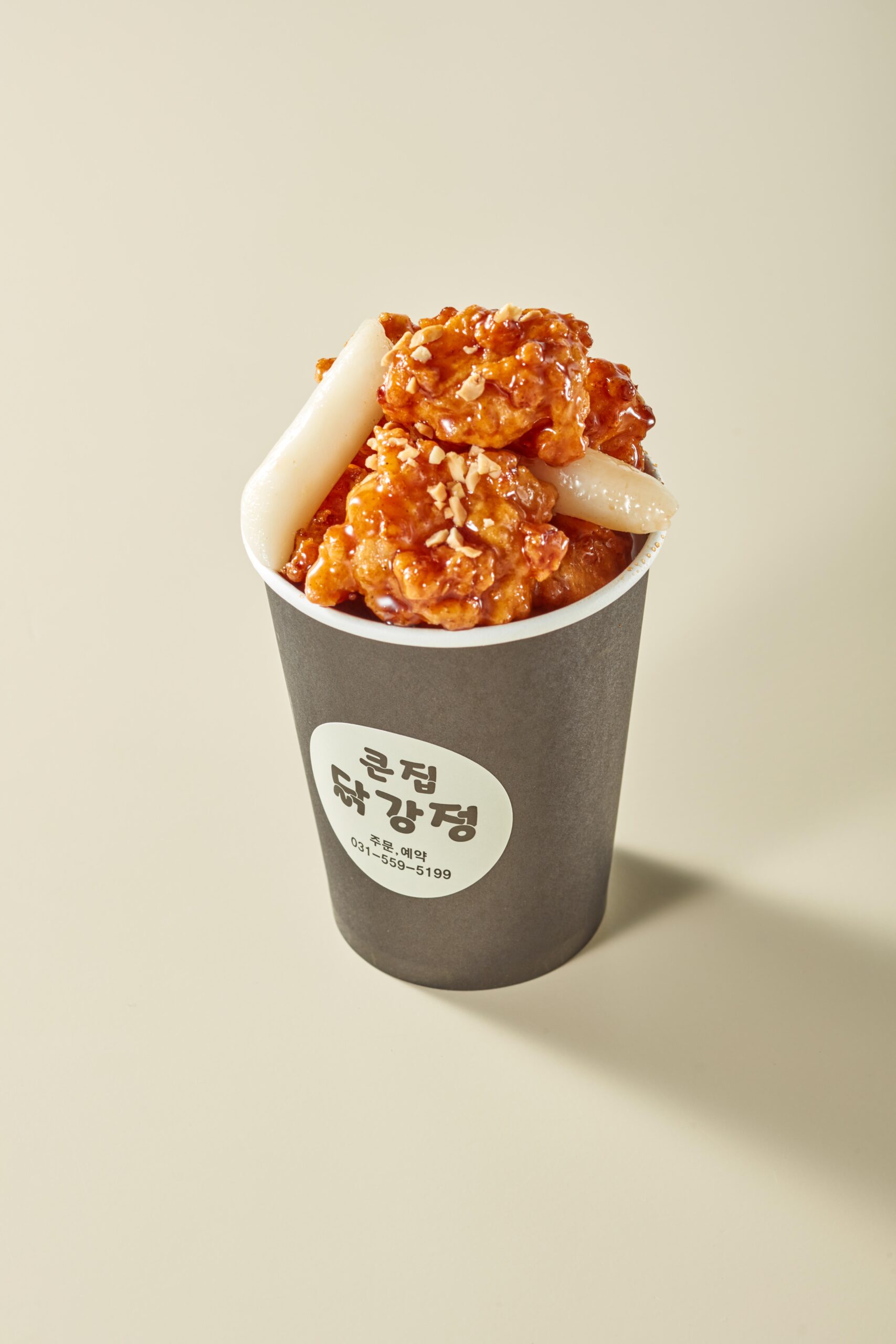 12온스 컵 안에 바삭한 닭강정을 가득 담아